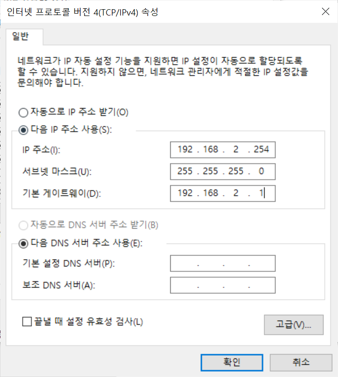 접속하시기 전에 네트워크 어댑터에서 IP주소를 변경해주셔야 합니다.
