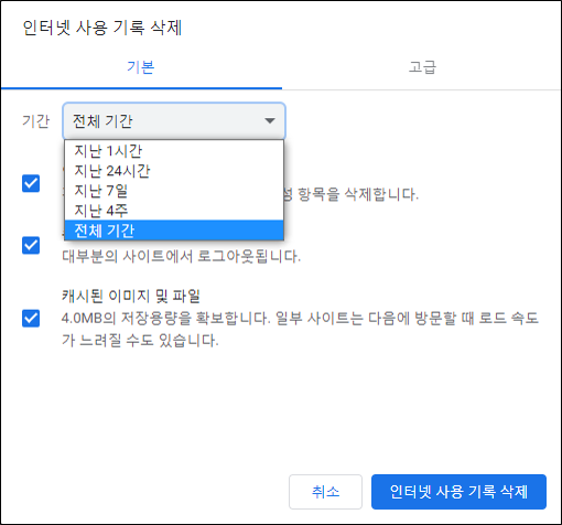 인터넷 기록 삭제에 들어가면 기간을 선택할 수 있는데 전체 기간으로 선택한 후에 3개 모두 '인터넷 사용기록 삭제'를 클릭해서 모두 지워주시면 됩니다.